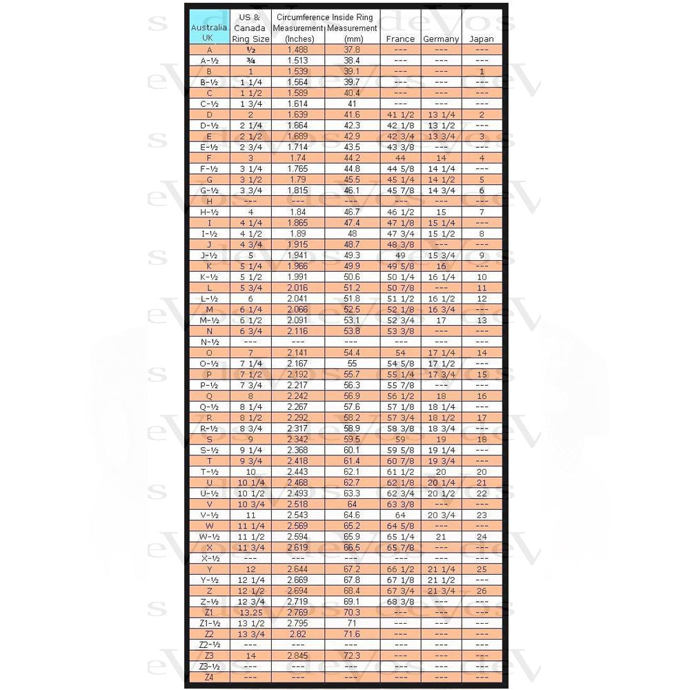 If you do not know your finger size, we suggest that you get your local Jeweller to size your finger accurately. If the size you’re given isn’t in the Australian/UK System, simply look down the sizing table of the given sizing system for the closest match and then follow the line all the way to the left. EG: US/Canada 6 ¼ = Australian/UK M